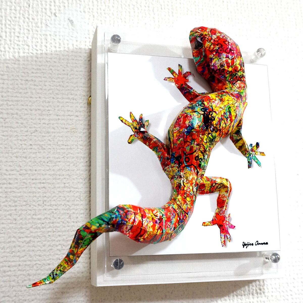 「こちらはトカゲのコラージュ画像を元にペーパークラフト技術を用いて立体的に表現した作品です。