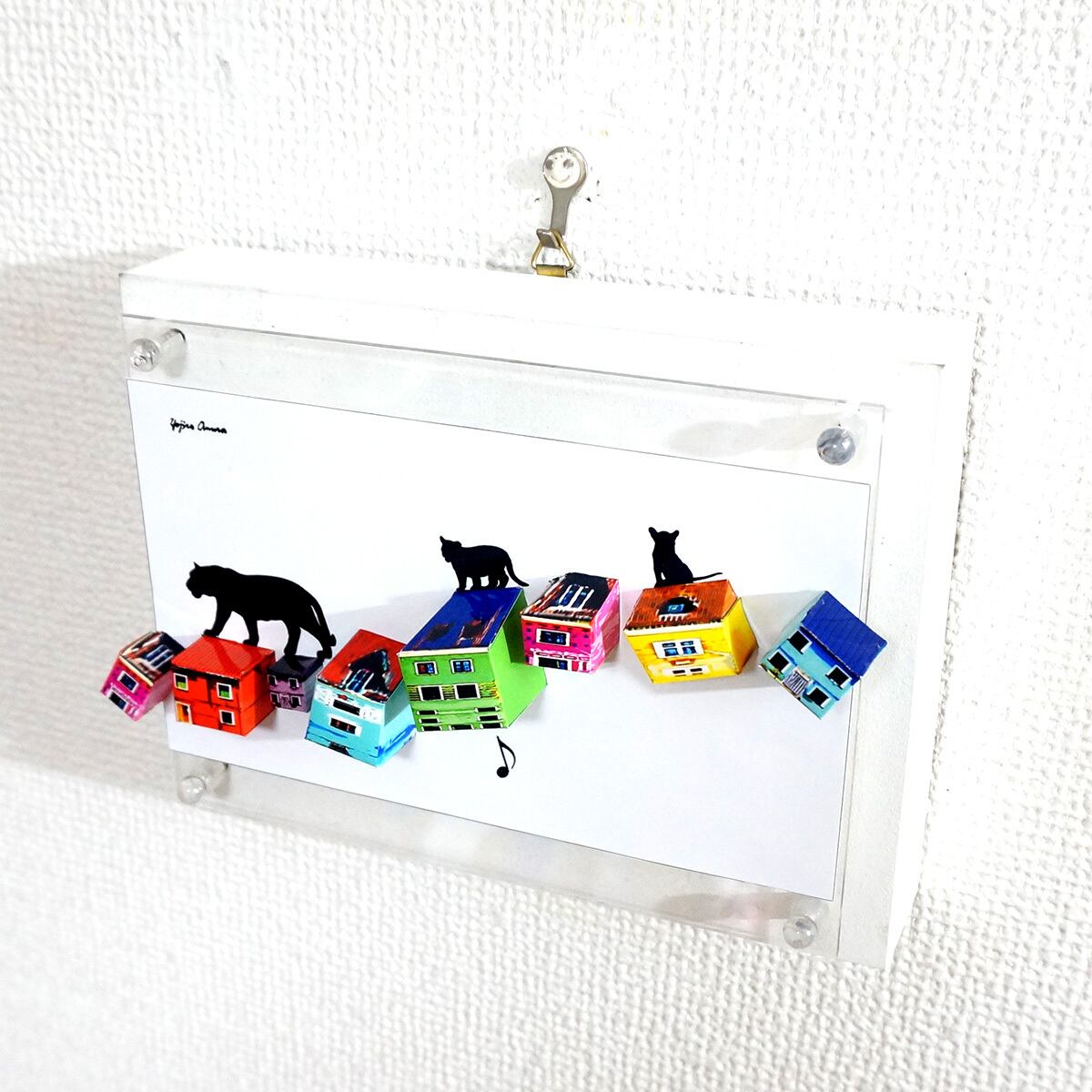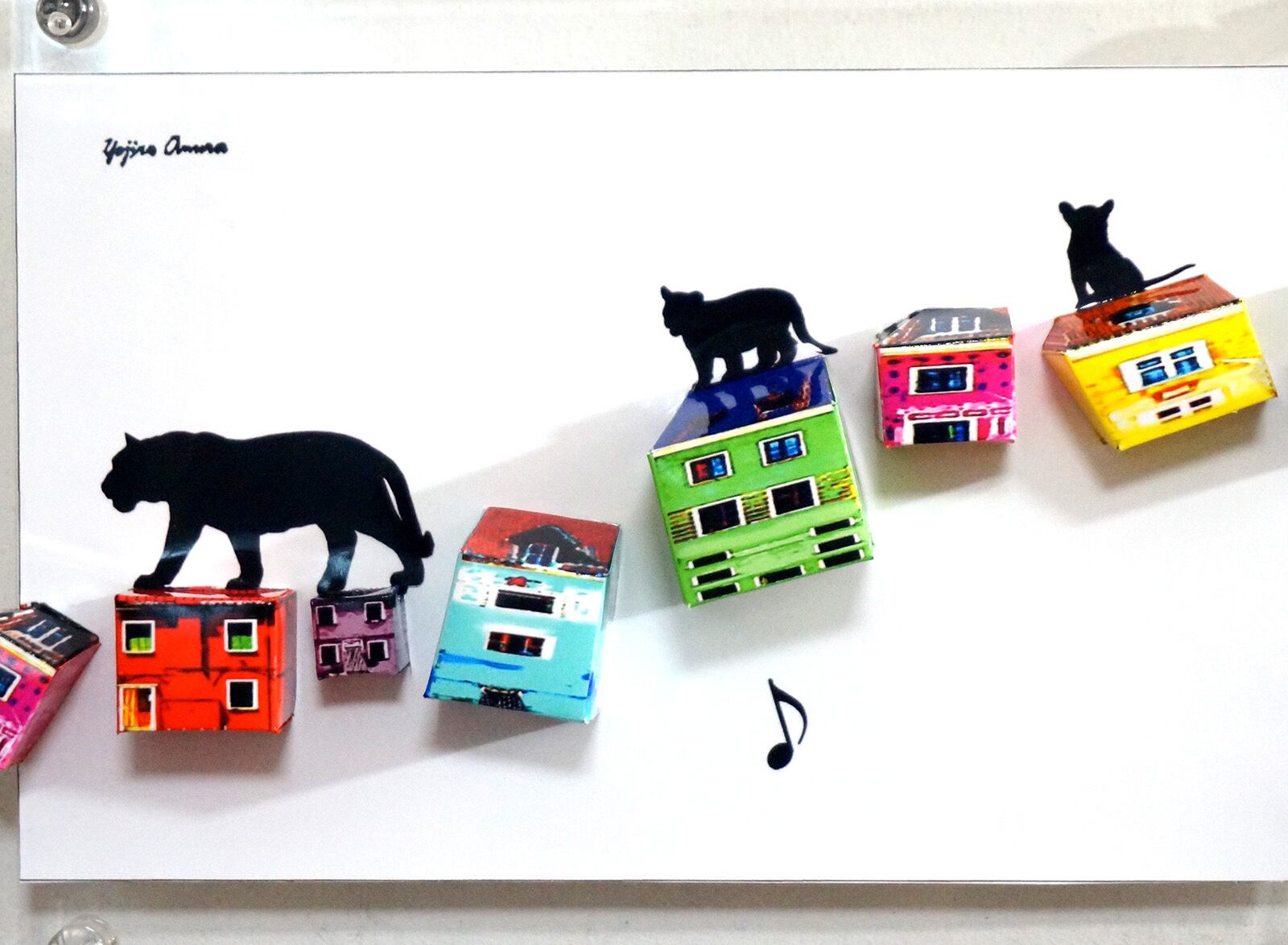 「こちらはトラの親子が宙に浮かんだ家の上を冒険している様子をペーパークラフト技術を用いて表した多面化写真彫刻作品です。
