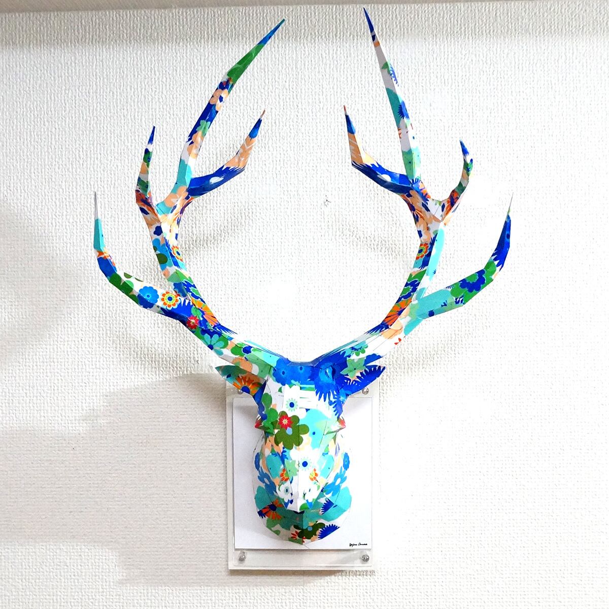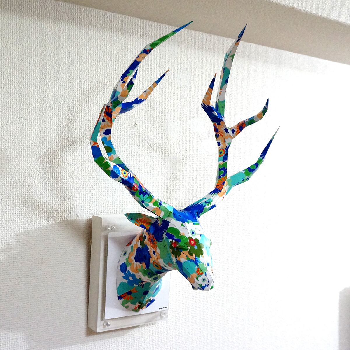 「ペーパークラフト技術を用いて制作した鹿のハンティングトロフィーの多面化写真彫刻作品になります。