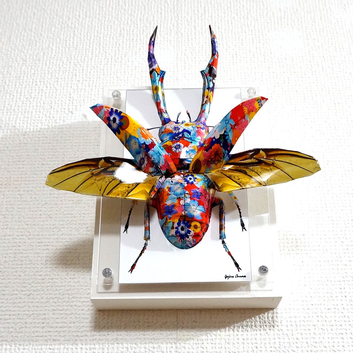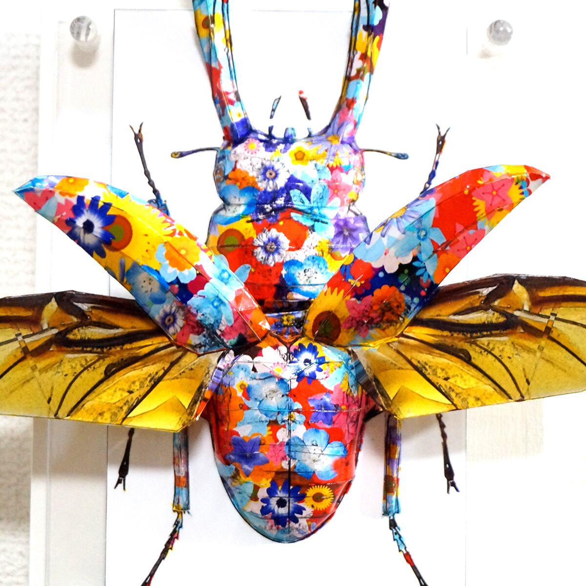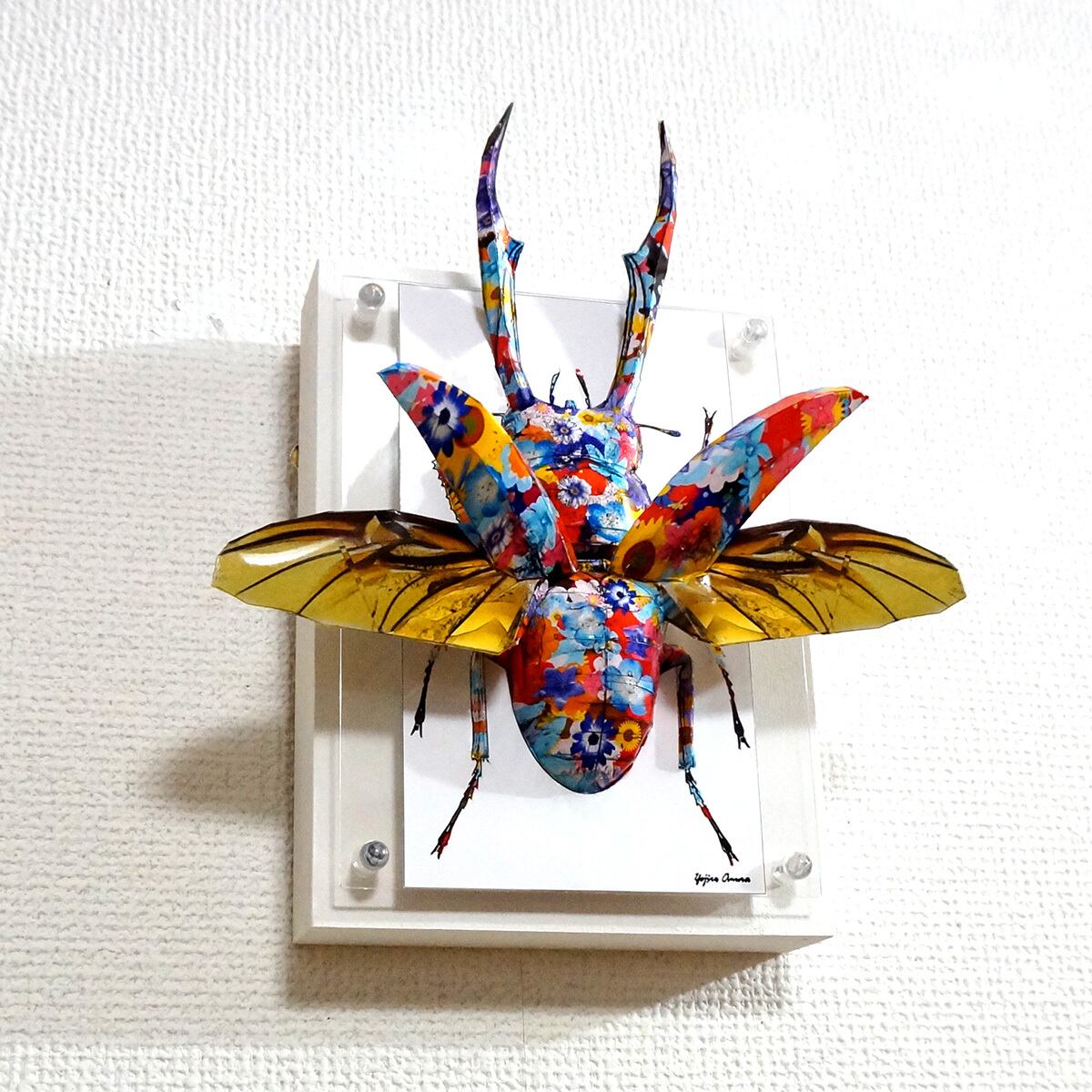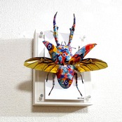 クワガタのシャープな曲線美にカラフルな花柄模様が映えるポップなイメージの作品に仕上がっております。」