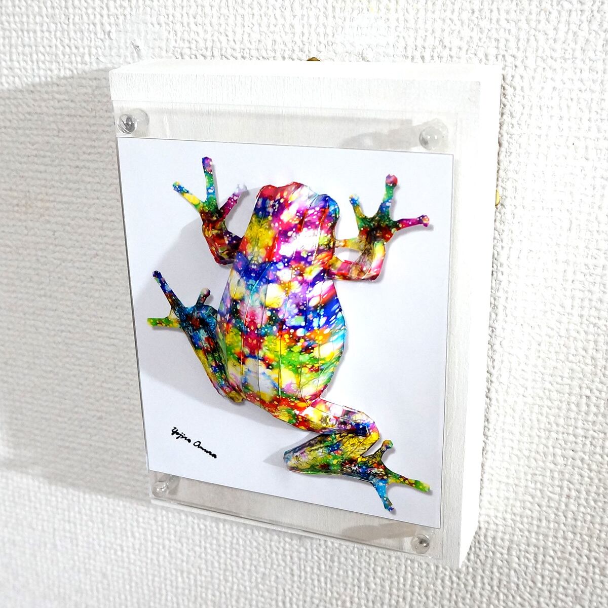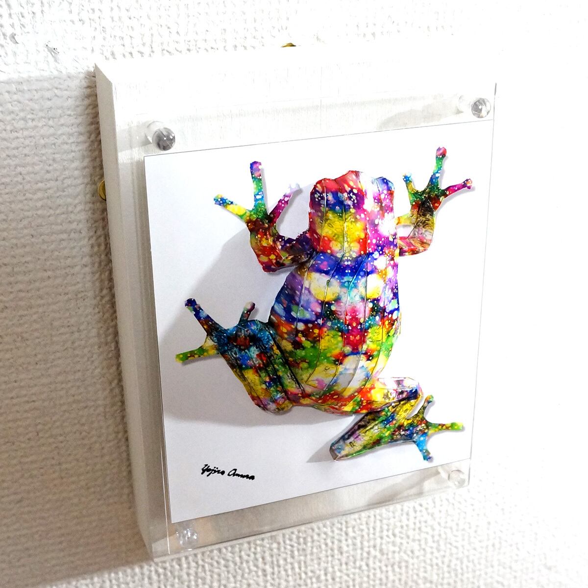 アマガエル本来の表情に煌びやかな模様を重ね合わせたデザインです。表面上は光沢紙の艶のある質感となっております。