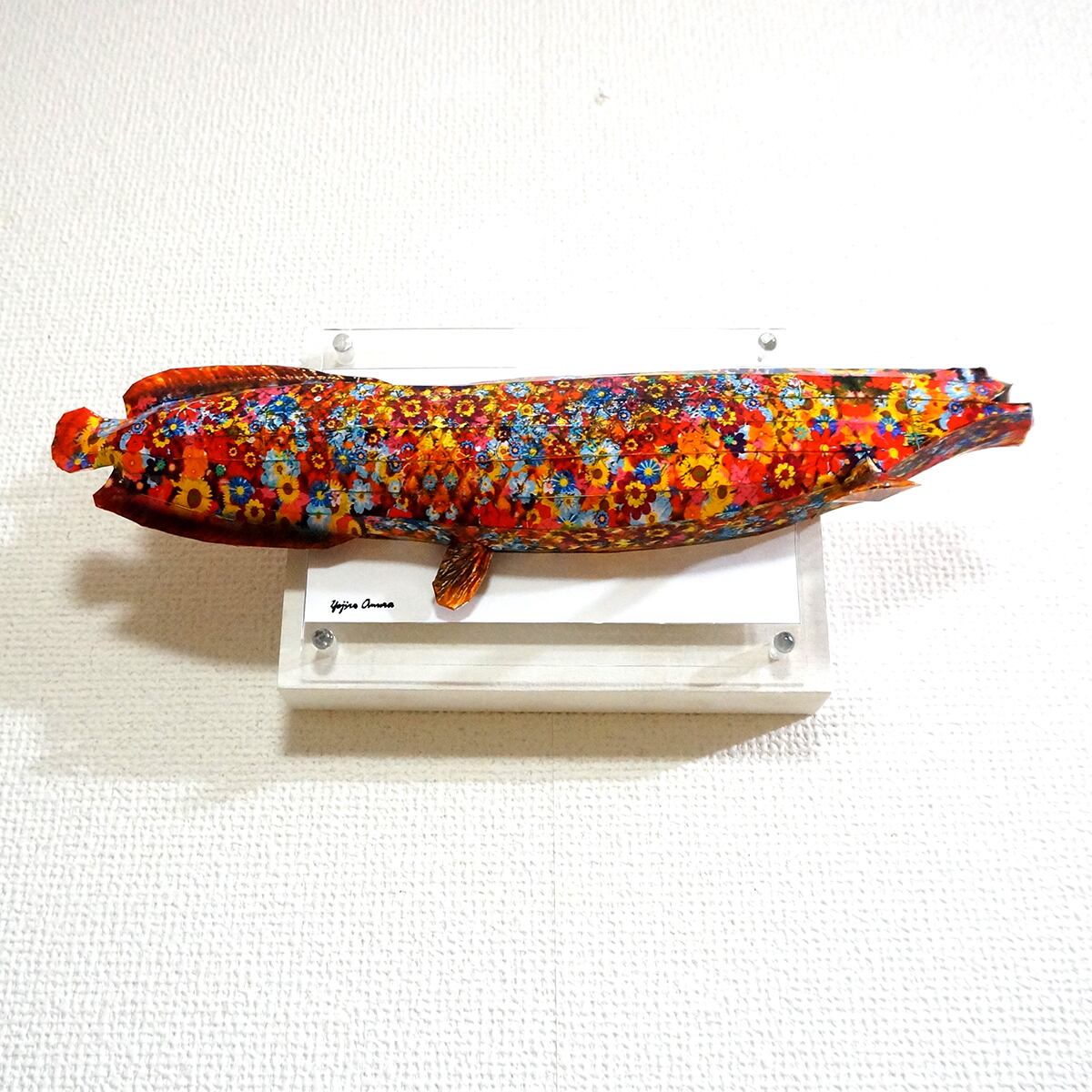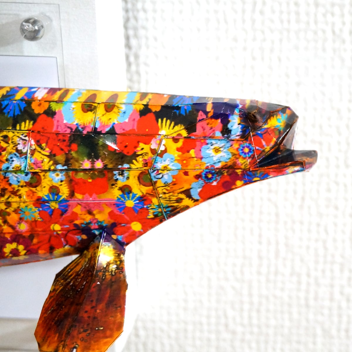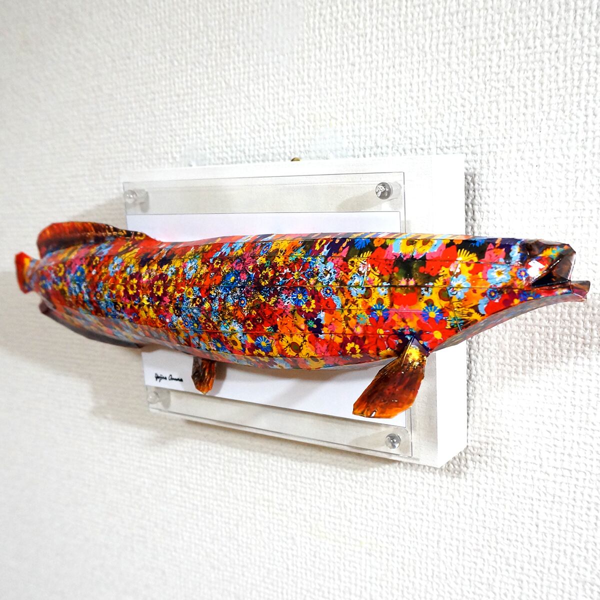 「こちらはピラルクをペーパークラフト技術を用いて立体的に表現した多面化写真彫刻作品です。