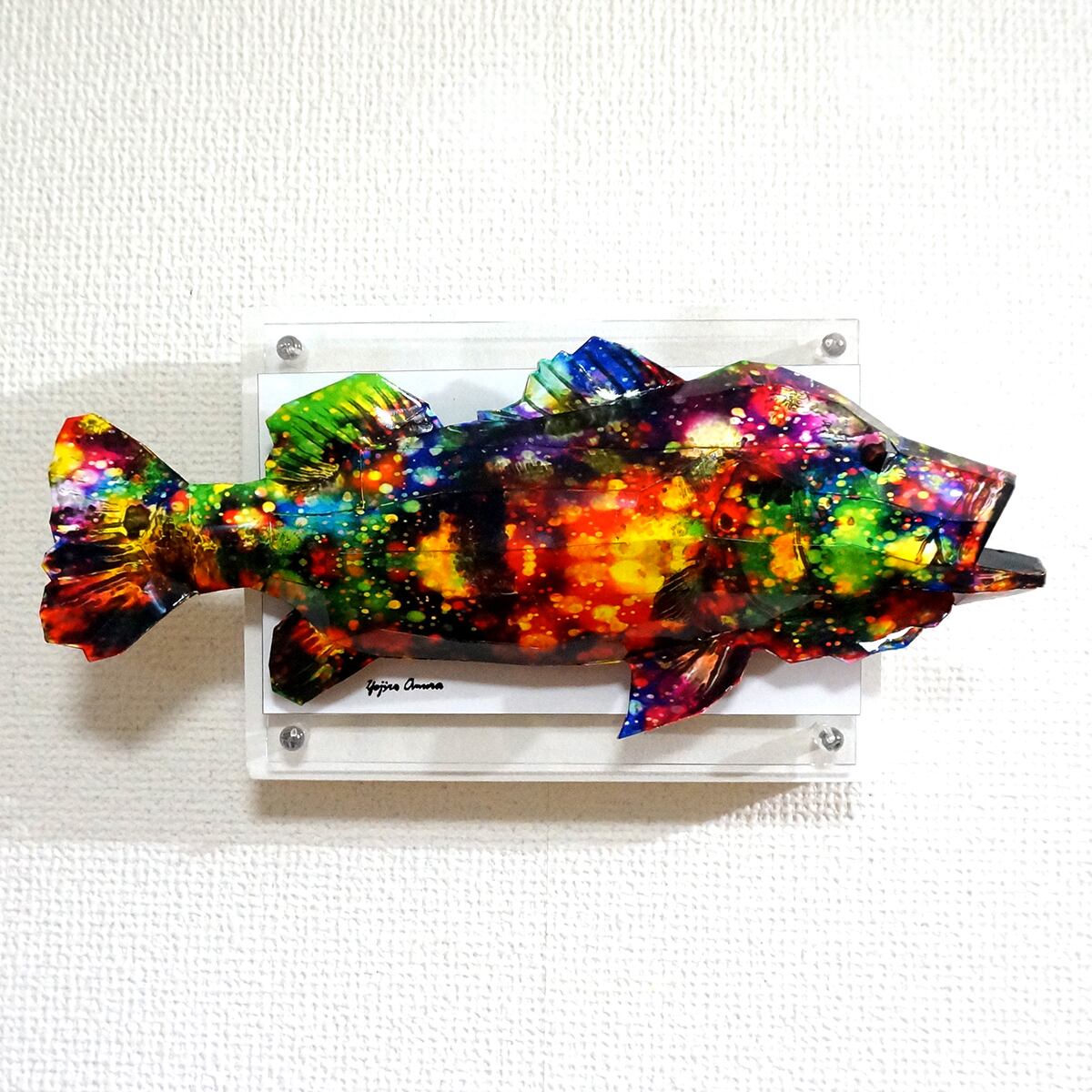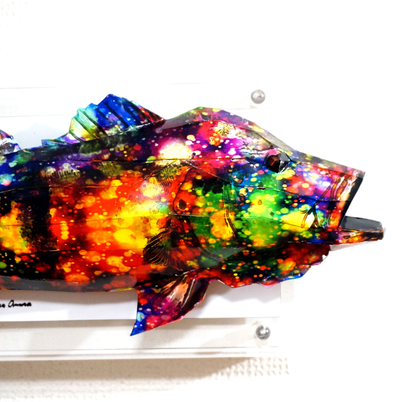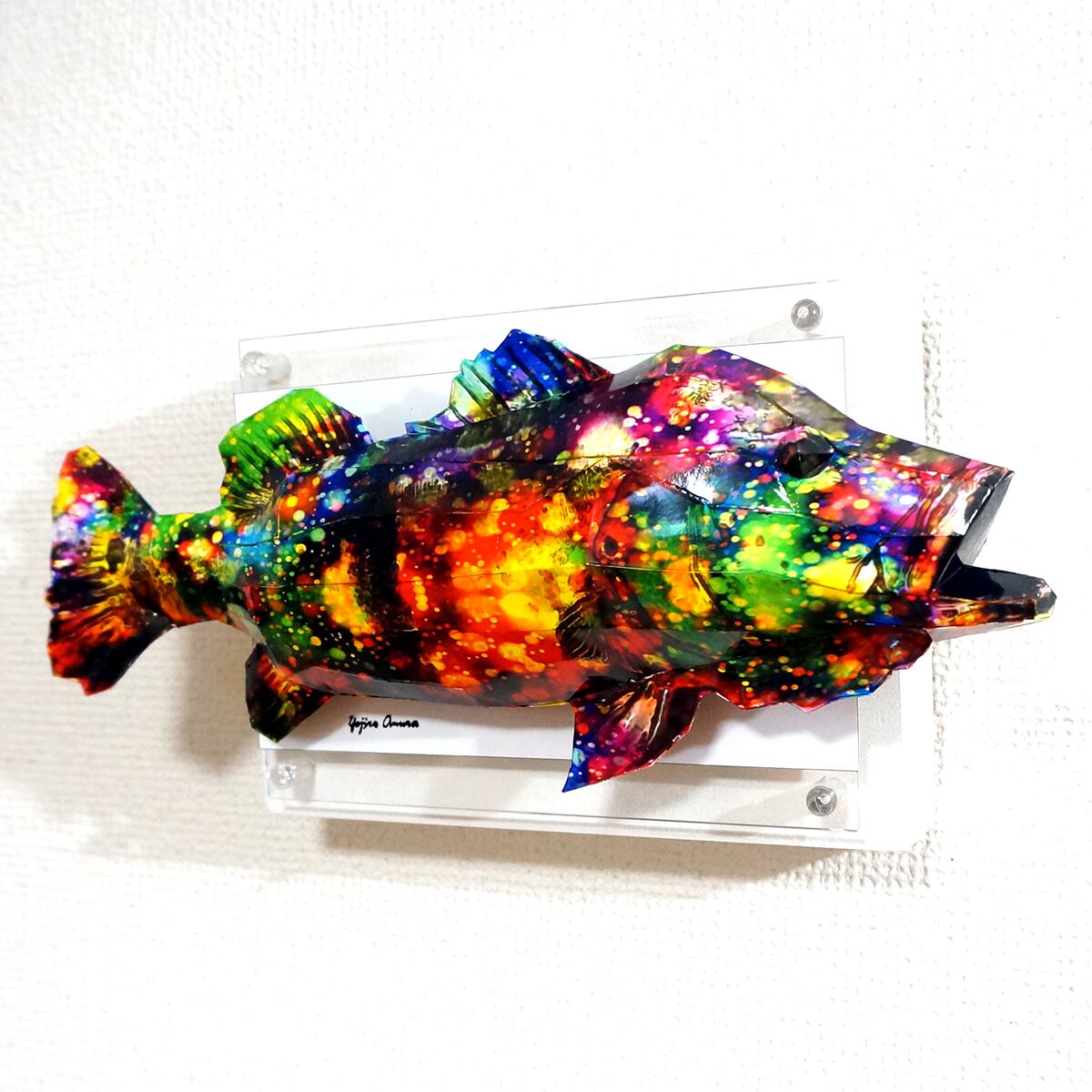 「ピーコックバスのコラージュ画像を作成しペーパークラフト技術を用いて立体的に表現した作品です。