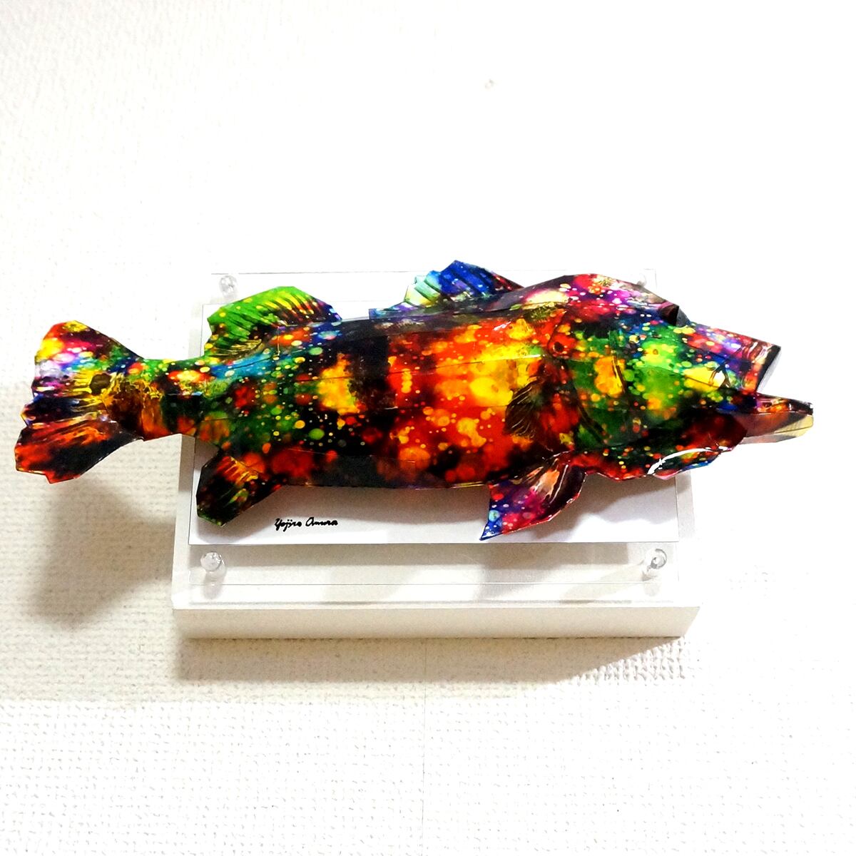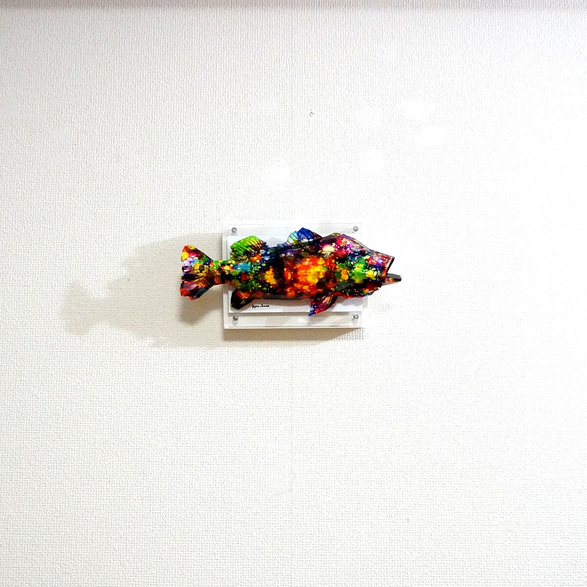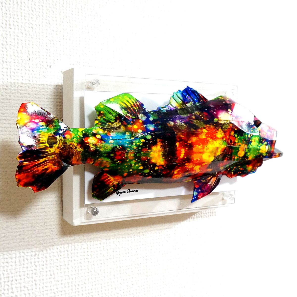 「ピーコックバスのコラージュ画像を作成しペーパークラフト技術を用いて立体的に表現した作品です。