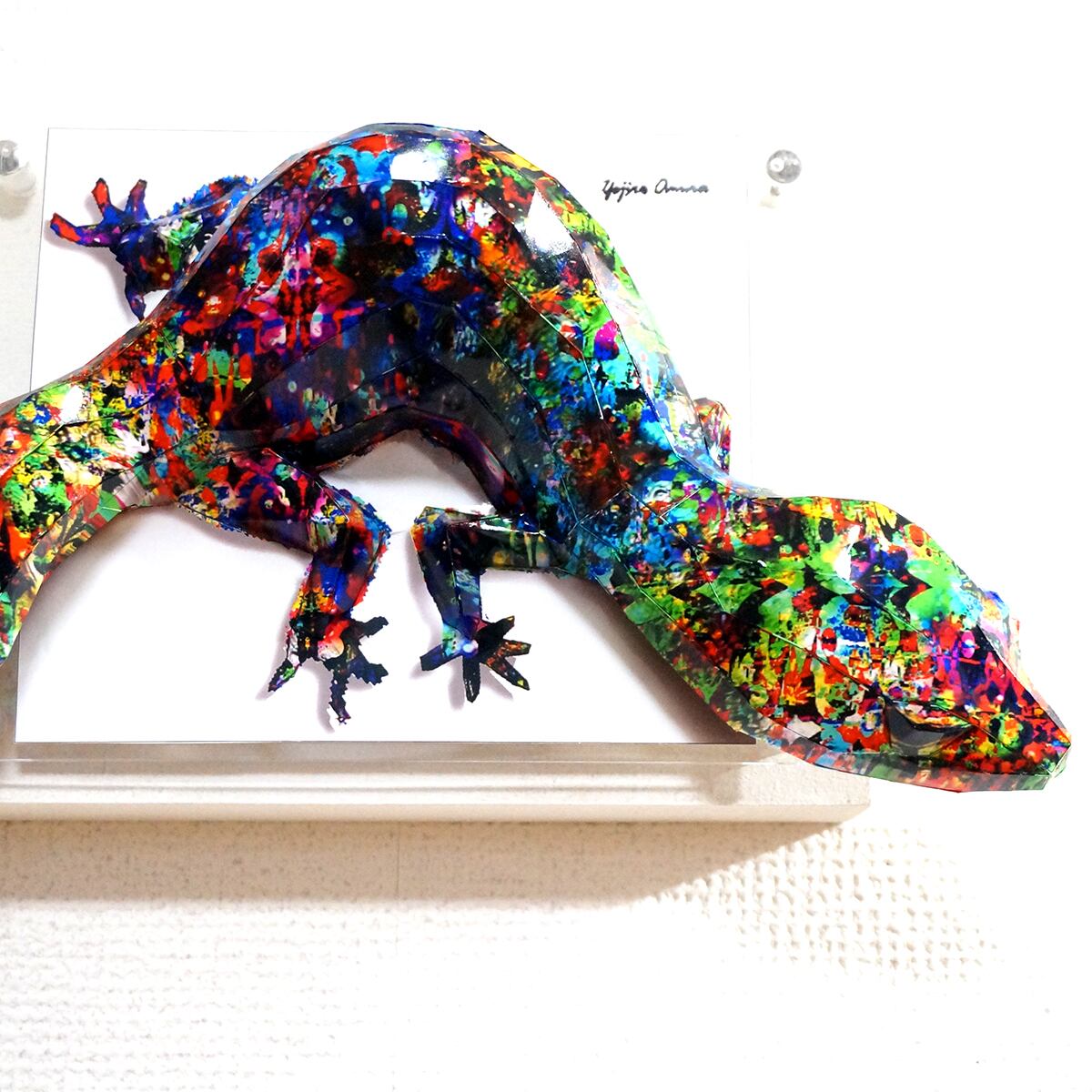 煌びやかなペイントをトカゲ本来の表情と重ね合わせたデザインです。表面上は光沢紙の艶のある質感となっております。
