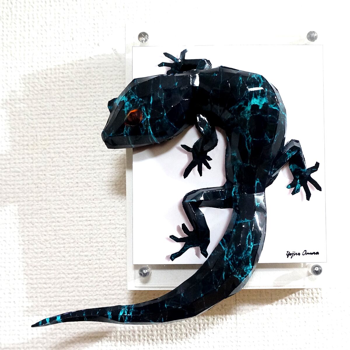 大理石から抽出した模様の割れ目部にブルーカラーを用いトカゲ本来の風合いなじませた。表面上は光沢紙の艶のある質感となっております。