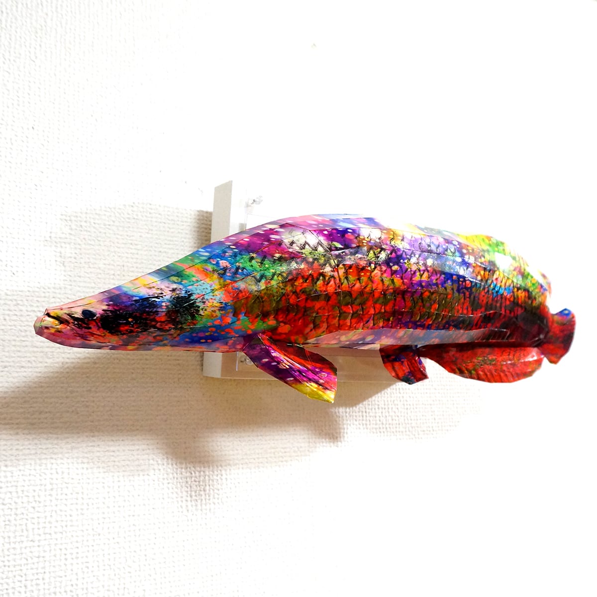 「こちらはピラルクーのコラージュ画像を作成しペーパークラフト技術を用いて立体的に表現した作品です。