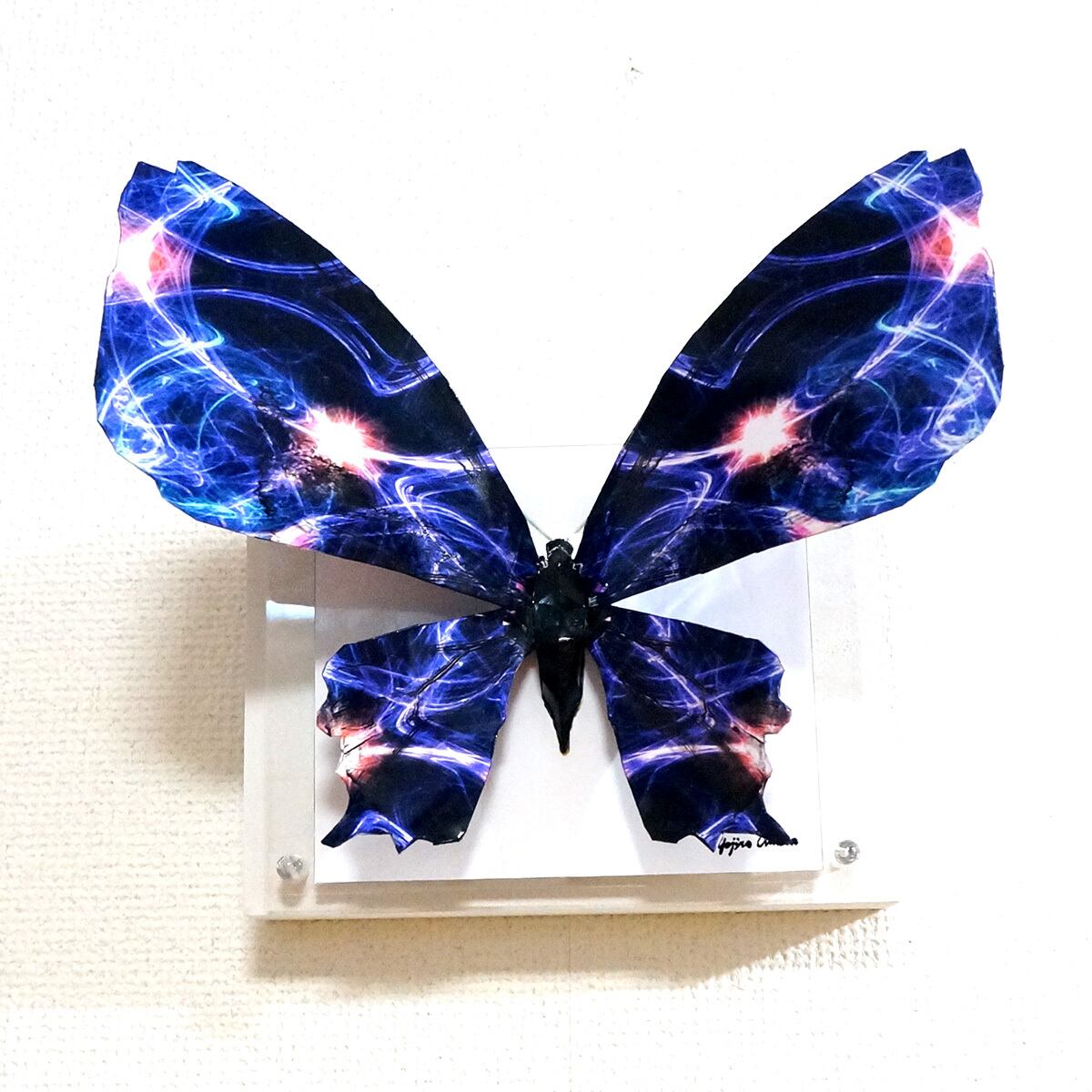 雷鳴をイメージした模様をチョウチョ本来の風合いに重ね合わせたデザインです。表面上は光沢紙の艶のある質感となっております。