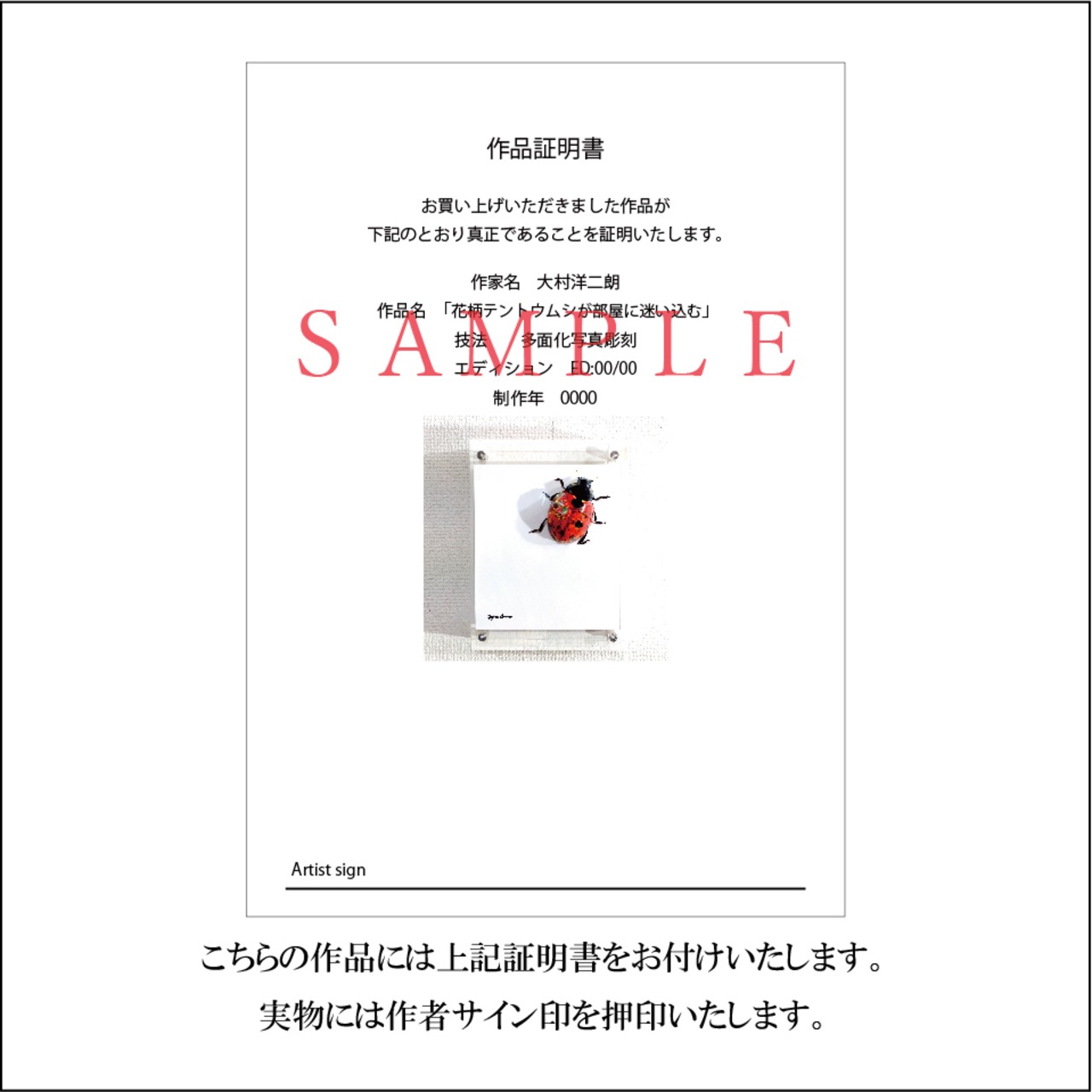 こちらの作品には作品証明書をお付けいたします。(画像参照)