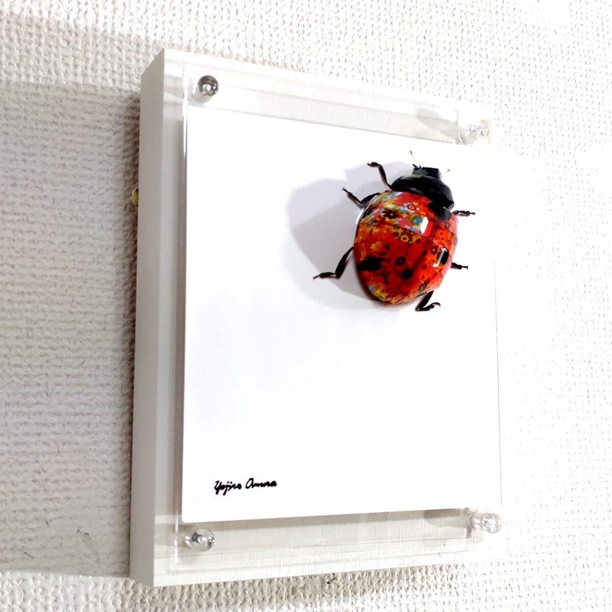 花柄のテントウムシがパネルの上部分に貼りついている様子を表現いたしました。