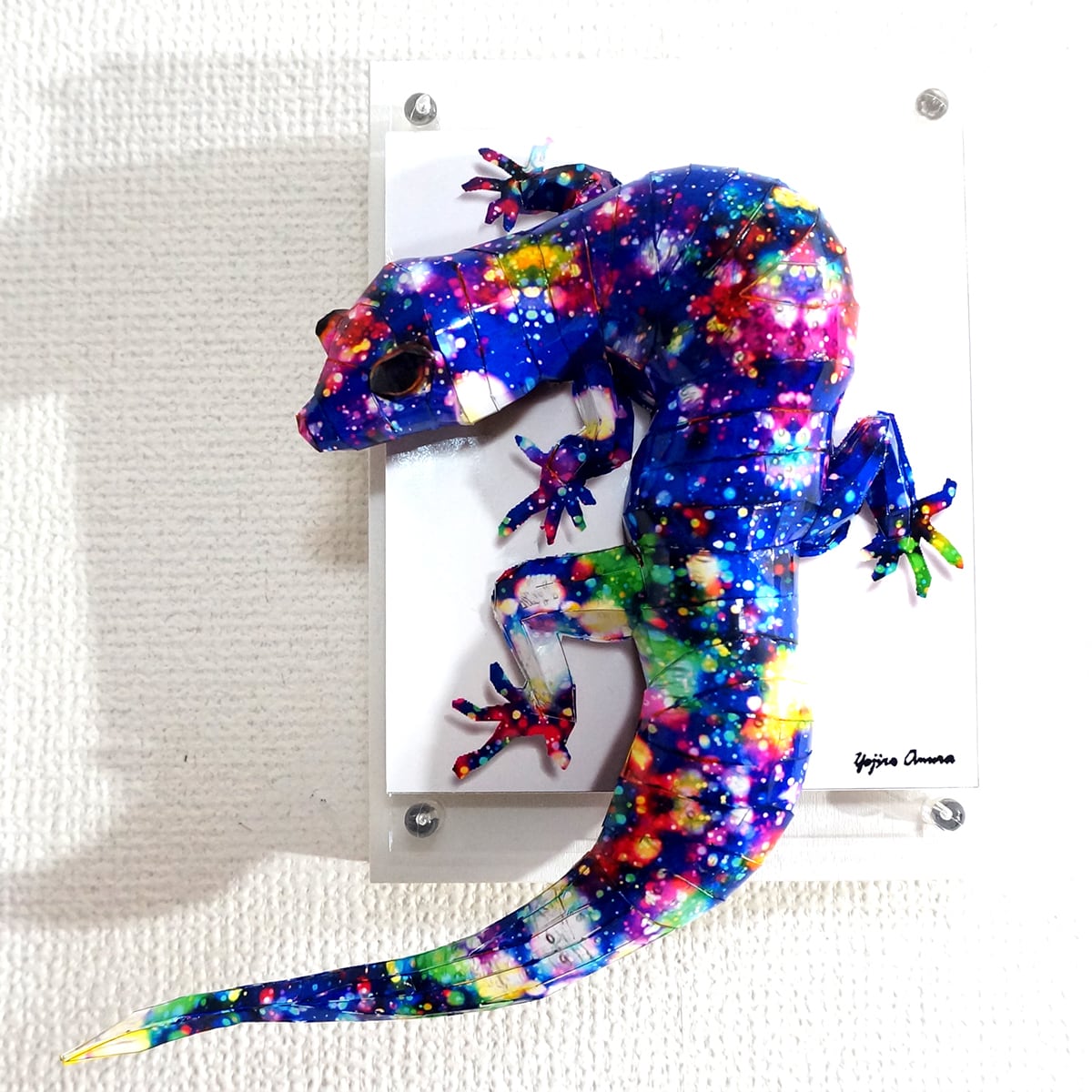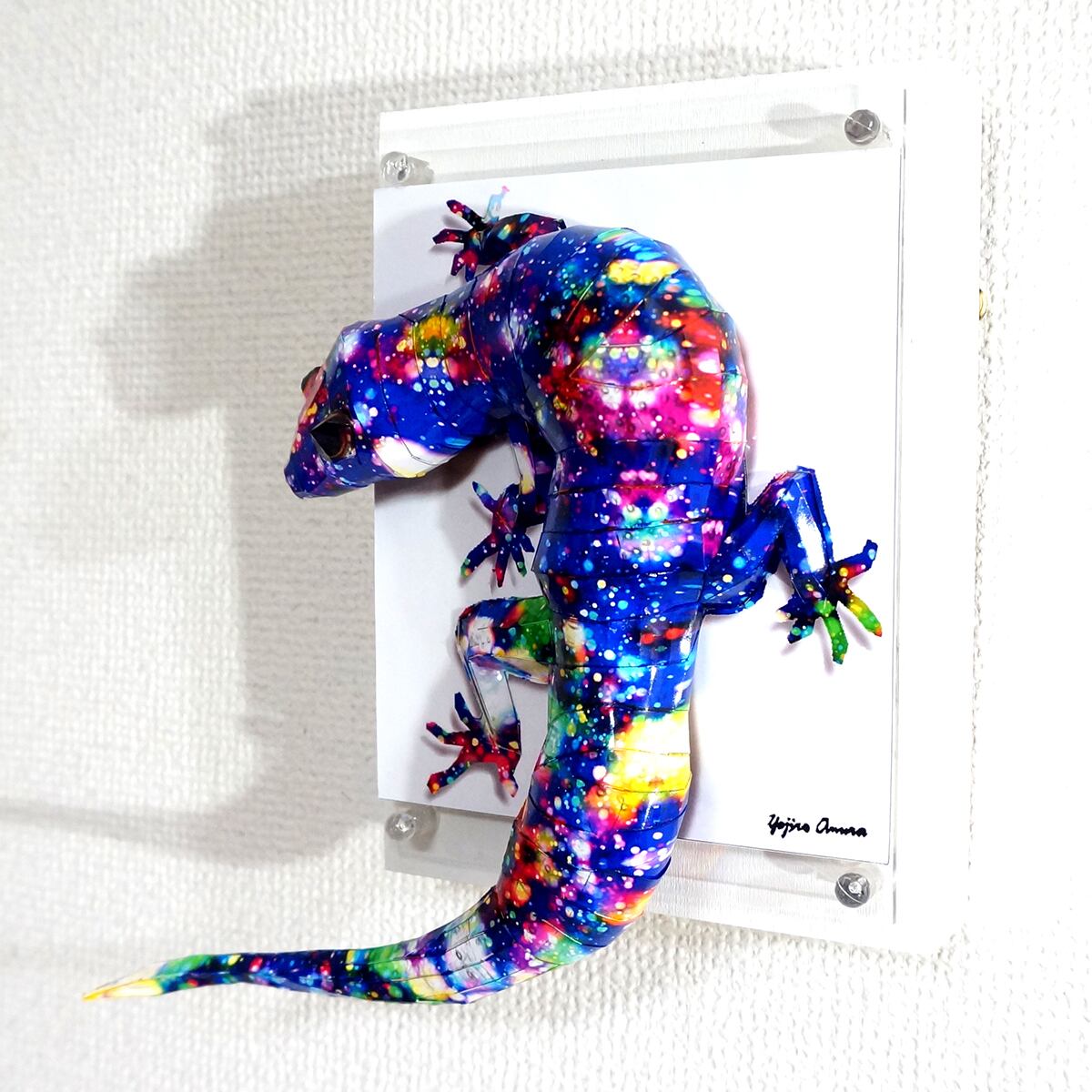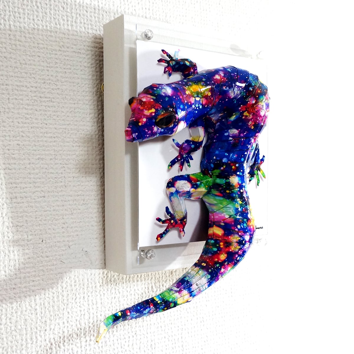 星空をイメージした模様とトカゲ本来の風合いを重ね合わせたデザインです。表面上は光沢紙の艶のある質感となっております。