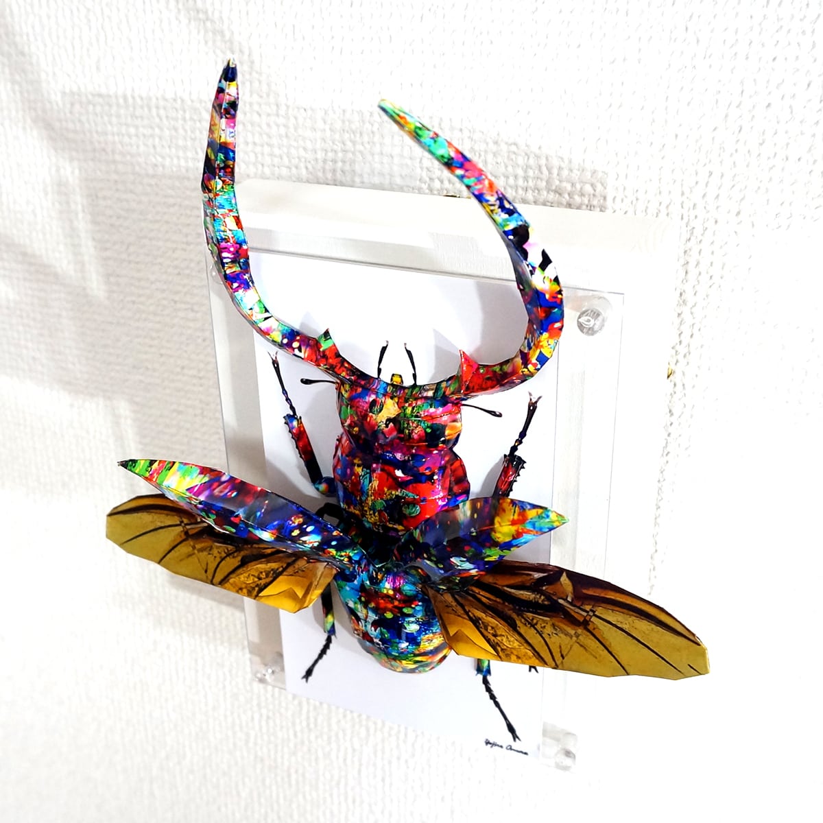 煌びやかでカラフルなイメージの模様をクワガタ本来の風合いに重ね合わせたデザインです。表面上は光沢紙の艶のある質感となっております。
