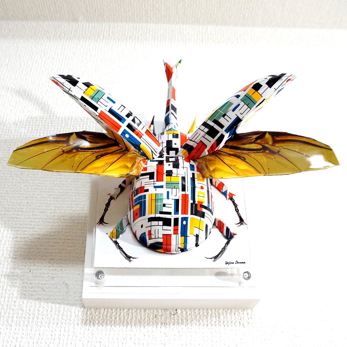 「ゾウカブトムシのコラージュ画像を作成しペーパークラフト技術を用いて立体的に表現した作品です。
