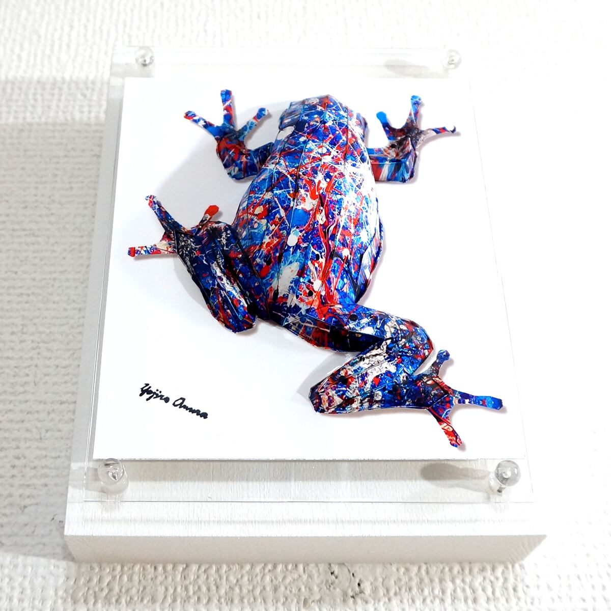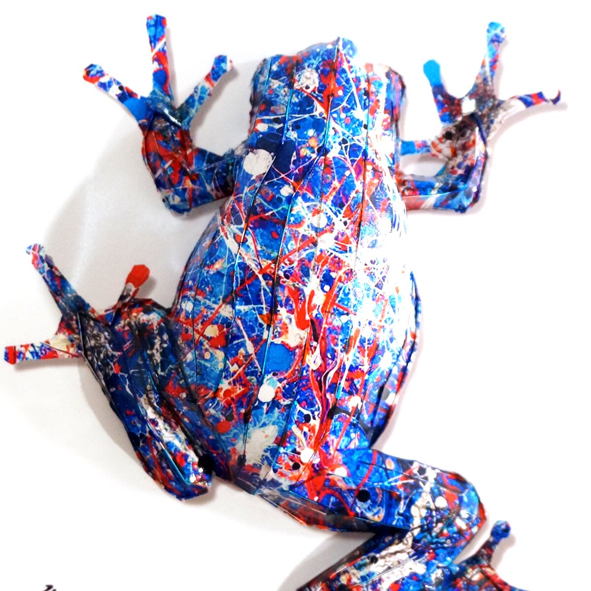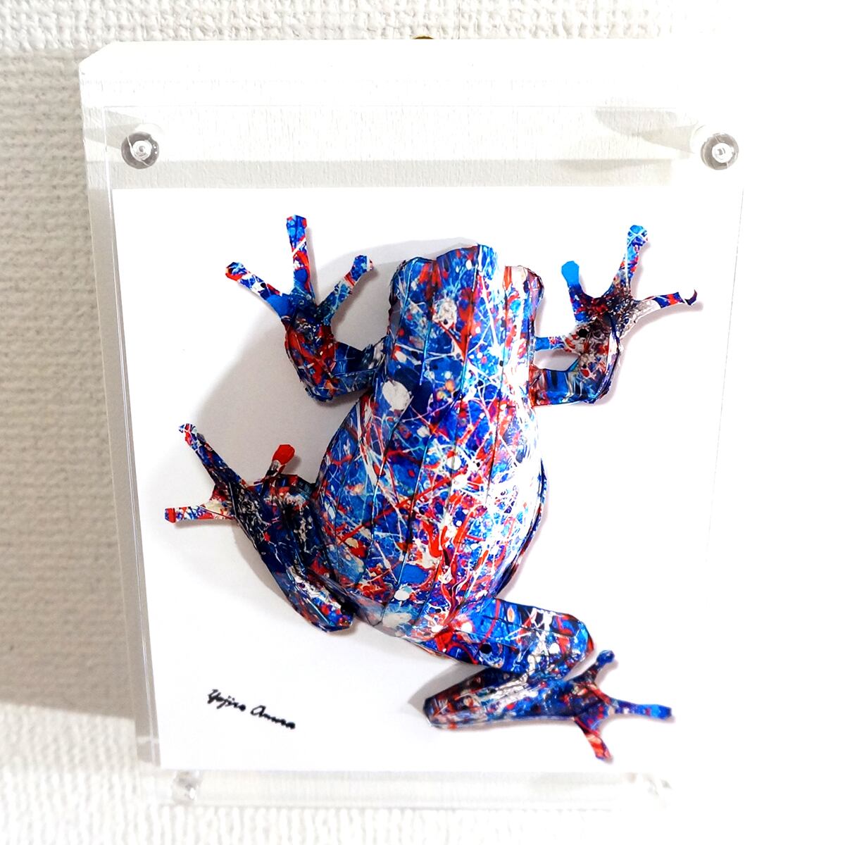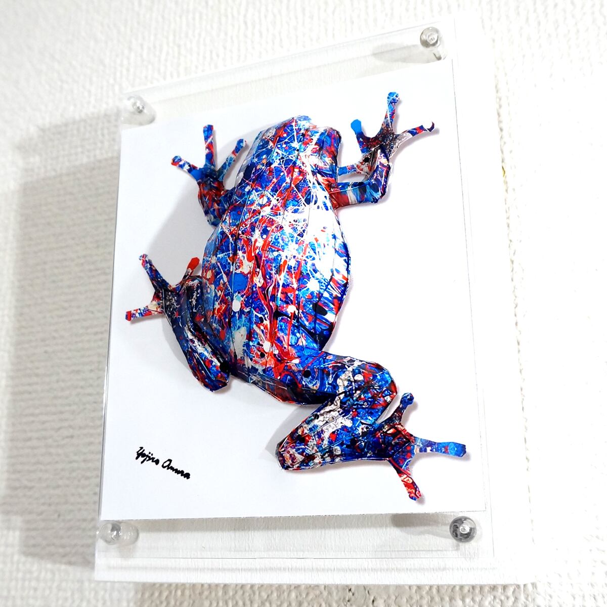 青を基調としたアクションペインティングをカエル本来の表情を重ね合わせたデザインです。表面上は光沢紙の艶のある質感です。