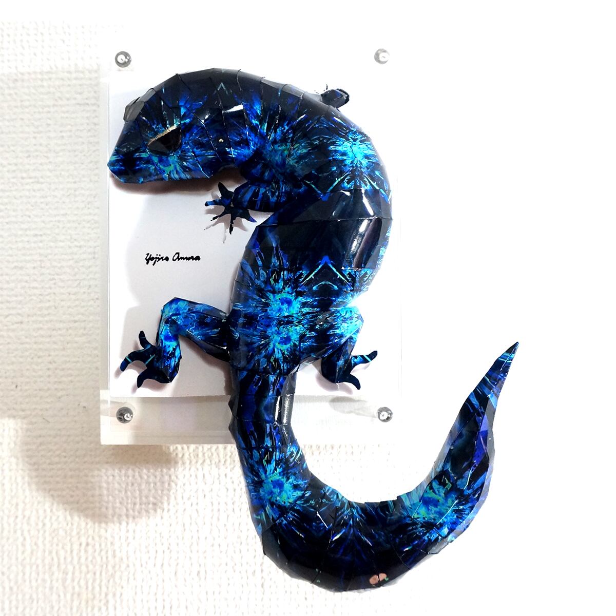 青色のガラスのミクロ画像をトカゲ本来の表情と重ね合わせたデザインです。表面上は光沢紙の艶のある質感となっております。