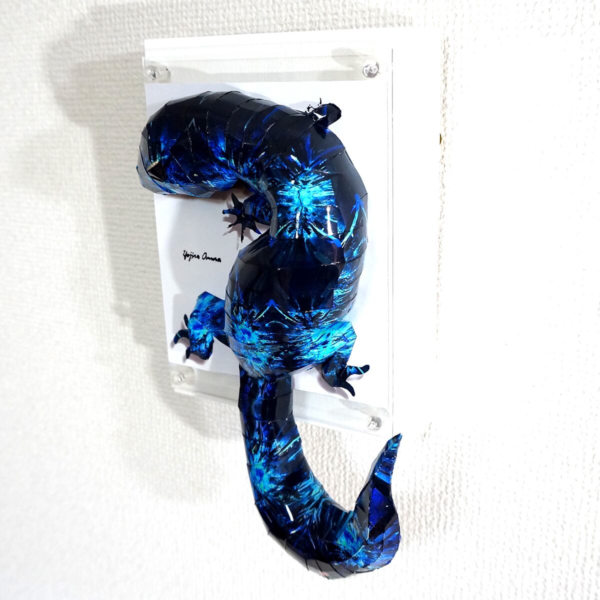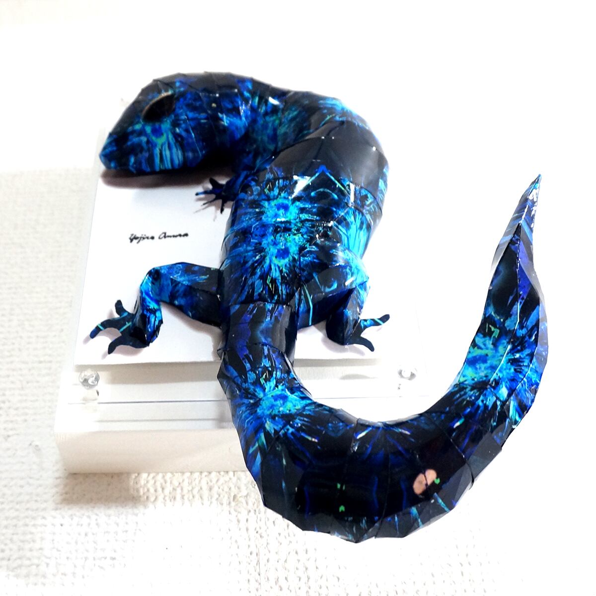 「こちらはトカゲのコラージュ画像を元にペーパークラフト技術を用いて立体的に表現した作品になります。