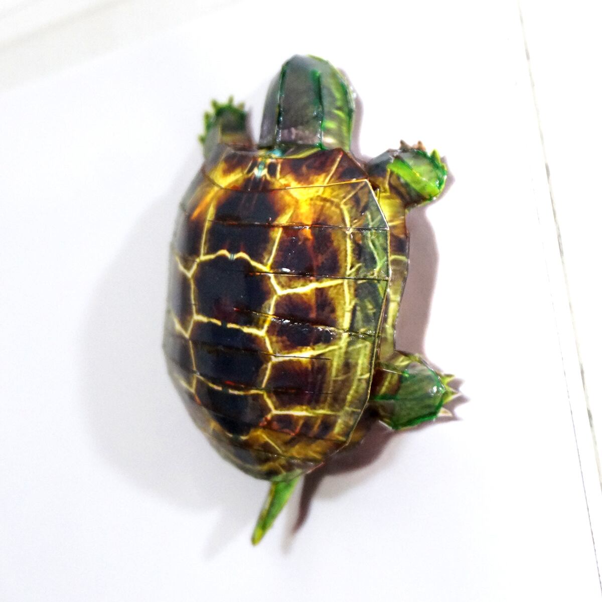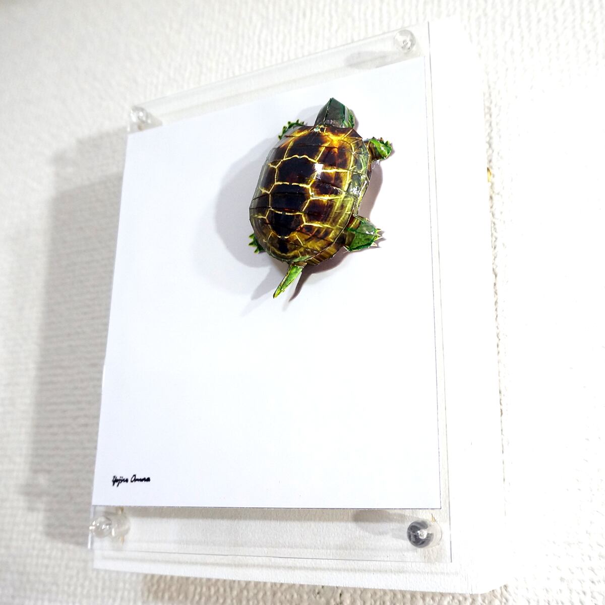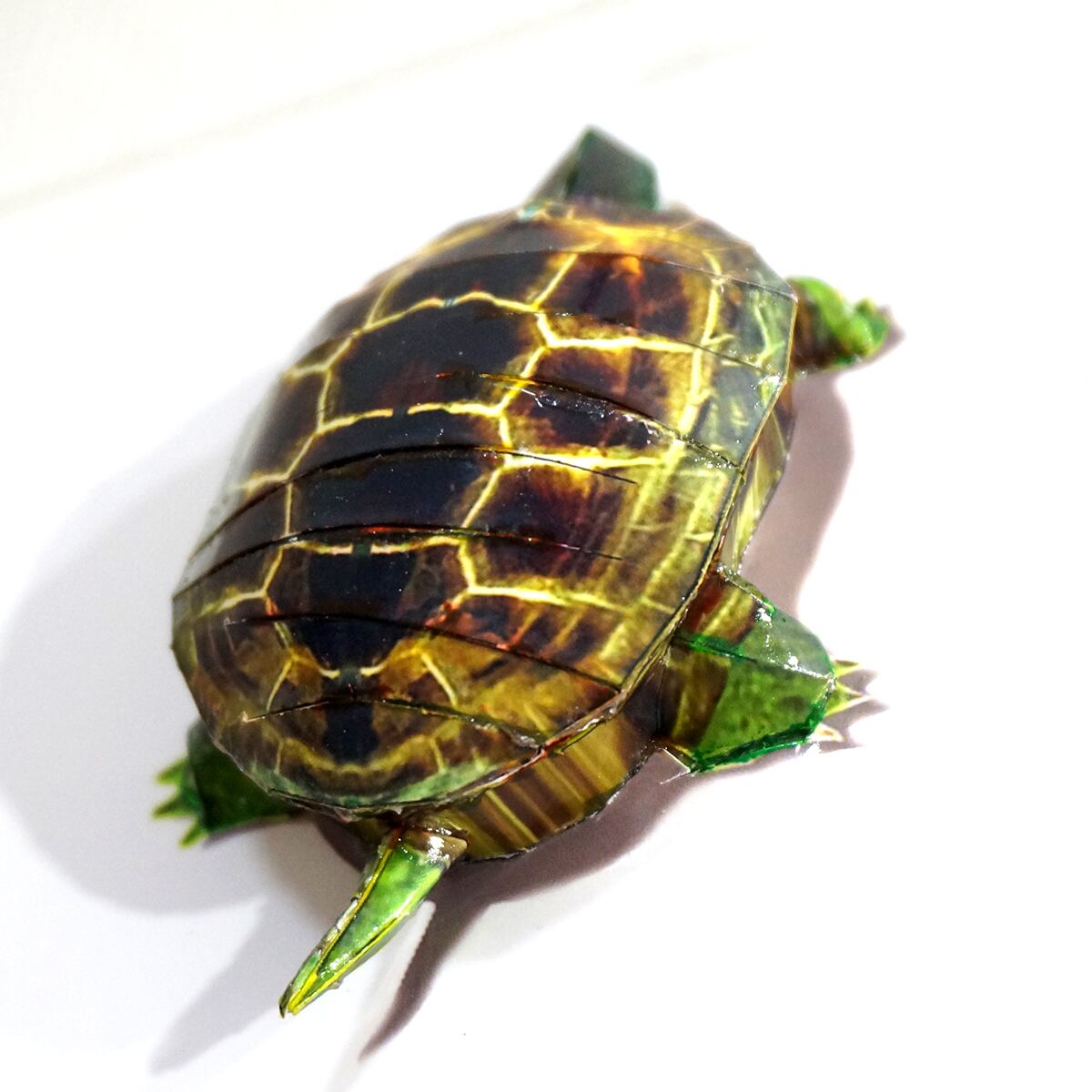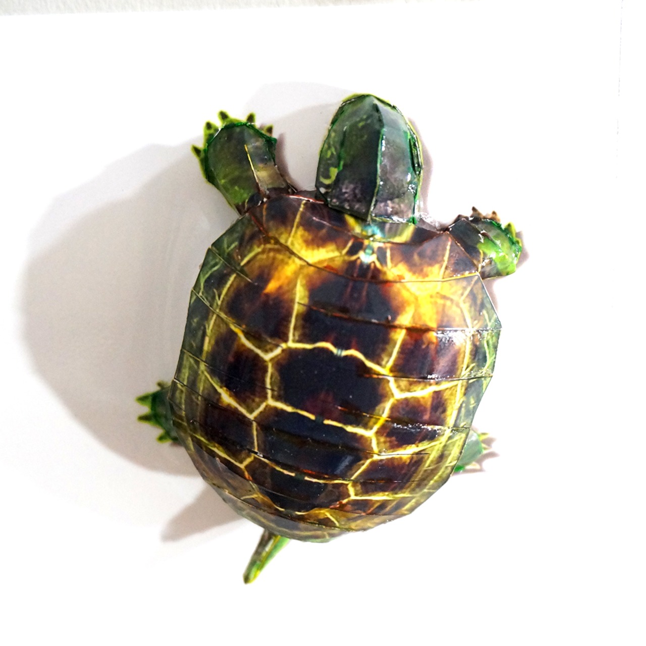 「亀のコラージュ画像を作成しペーパークラフト技術を用いて立体化した作品です。
