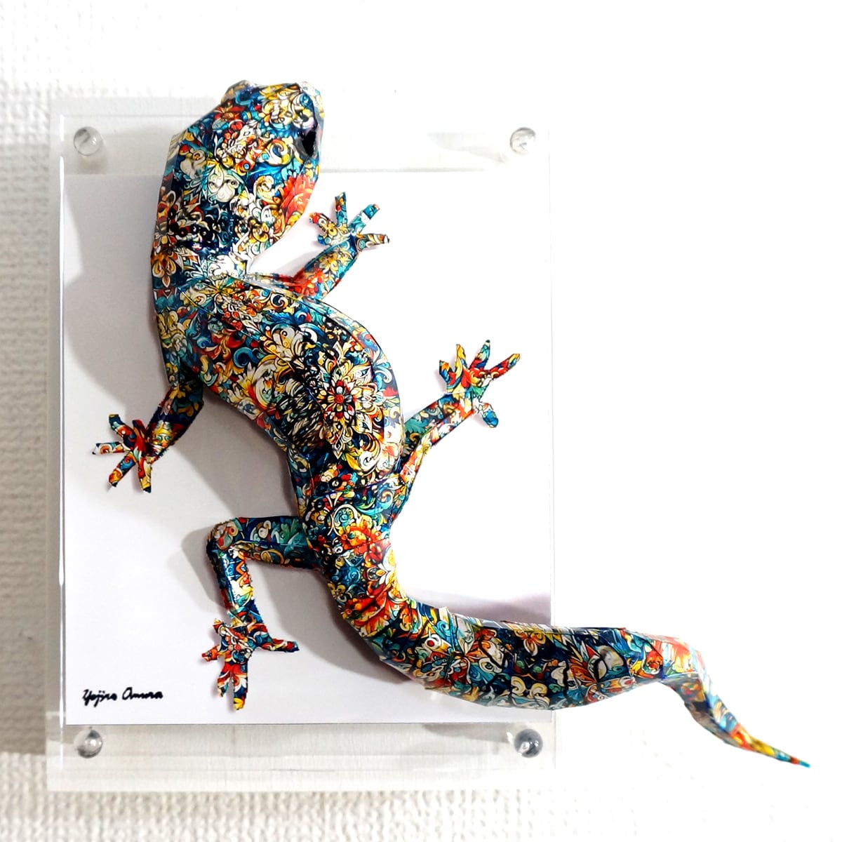 チベット仏教を思わせるシャカデリックな模様にトカゲ本来の模様に重ね合わせたデザインです。表面上は光沢紙の艶のある質感となっております。